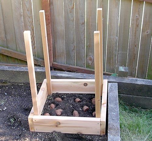 Kaliteli ağaç kullanmanız kutunun dayanıklılığını artırır. 1. 5 cm kalınlık 5 cm uzunluğundaki tahta çubuğumuzu 90cm'lik 4 adet çubuk halinde keselim ve bu çubukları ilk şekilde görüldüğü üzere kare oluşturacak şekilde toprağa dikelim. 2. 5 cm kalınlık 15cm eninde olan kalaslarımızı da, 12 adet 53 cm uzunluğunda 12 adet 60 cm uzunluğunda olacak şekilde parçalara ayıralım. 3. Bu parçalar üzerindeki vida yerlerini önceden hazırlayalım. Bu işlem için matkap kullanabilirsiniz. 4. Daha sonra ilk parçaları çubuklara ilk şekilde görüldüğü üzere vidalayalım. 5. Daha sonra ikiye böldüğümüz tohumluk patatesleri zeminden 10cm derinliğe koyalım ve tahtaların yükseklik hizasına kadar üzerlerini toprak ile kapatalım. Bu süreçten sonra bitkinin yetişmesini bekleyelim. 6. Bitkinin toprak üstünde kalan boyu yaklaşık 30 cm olduğu zaman tekrar bir kat daha tahta monte edelim ve bitkinin 1/3 yüksekliğine kadar tekrar toprak dolduralım. Bu işleme kutunun yüksekliği tamamlanıncaya kadar periyodik olarak devam ederlim. 7. Kutu tam olarak bittikten bir süre sonra ilk hasadımızı alabiliriz. Bunun için en alttaki tahta parçalarının vidalarını çıkartalım. Patateslerimiz bizi orada bekliyor olacaktır. Patatesleri çıkardıktan sonra toprağı tekrar eski yerine koyalım ve tahtayı tekrar vidalayalım. Sonraki seferde (bir süre daha geçtikten sonra) bir üst kattaki tahtayı çıkartalım ve aynı işlemi tekrarlayalım. Bu şekilde kutu tamamen bitene kadar devam edebiliriz. Notlar: • İklim ve ortam şartları müsait olduğu takdirde hasat mevsimi sonunda kutudan toplamda 50kg civarı patates elde etmiş olabilirsiniz. • Kutu içerisindeki patatesler, toprak içerisinde olanlara göre daha hızlı su kaybedeceklerinden dolayı normalden daha sık sulanmaları gerekmektedir. Bu patateslerinizin düzgün gelişmesi için en önemli noktalardan biridir. • Suyu tek seferde çok fazla vermek yerine bu süreci daha sık ve az miktarlarda vermek daha kaliteli patatesler yetiştirmenizi sağlayacaktır. • Don mevsimi gelene kadar dikey patates kutunuzdan ürün almaya devam edebilirsiniz. • Bu kutu için kullanacağınız tahta, cinsine göre pahalıya mal olabilir. Fakat kaliteli tahtadan yapılmış kutuları birkaç yıl boyunca bozulmadan kullanabilirsiniz. Buna rağmen kalitesiz tahtadan yapılan kutular kısa süre içerisinde hava şartlarından dolayı çürümeye ve bozulmaya başlayacaktır. • Burada anlattığımız tahta sistemi yerine patatesleriniz sert kutular içerisinde veya eski otomobil lastiklerini üst üste koyarak yetiştirebilirsiniz. Fakat bu durumda, alt kısımlardaki patatesleriniz yetişmiş olsa bile onları çıkarmak için sezon sonunu beklemeniz gerekir. Kutu sisteminde olduğu gibi alt kısımları açarak patatesleri erkenden çıkartamazsınız.